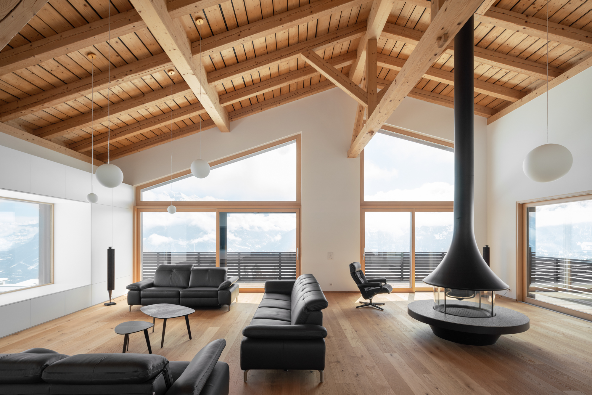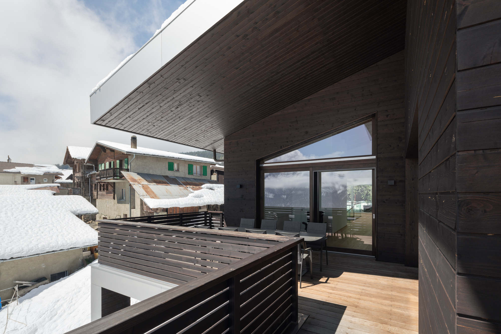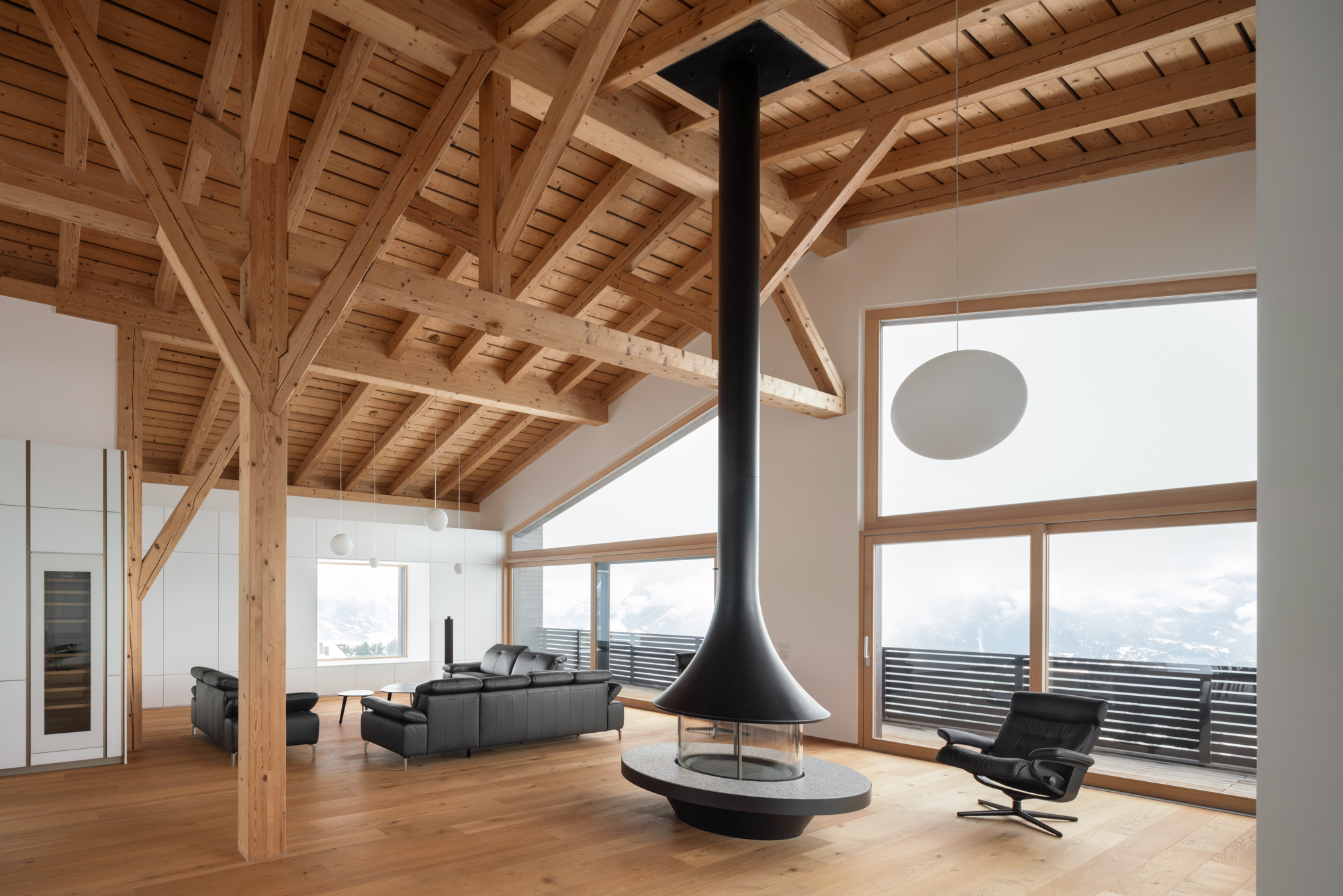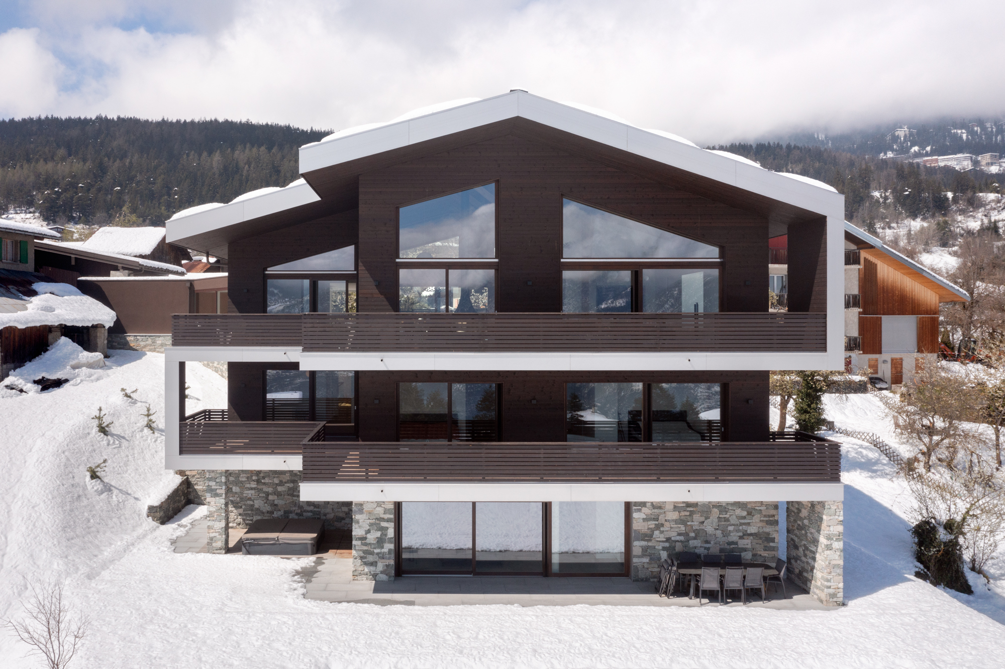 Jede Etage verfügt über großzügige Außenbereiche, die ein spektakuläres Panorama auf die Walliser Alpen sowie einen atemberaubenden Blick auf das Rhonetal, das sich bis nach Leuk erstreckt, bieten.