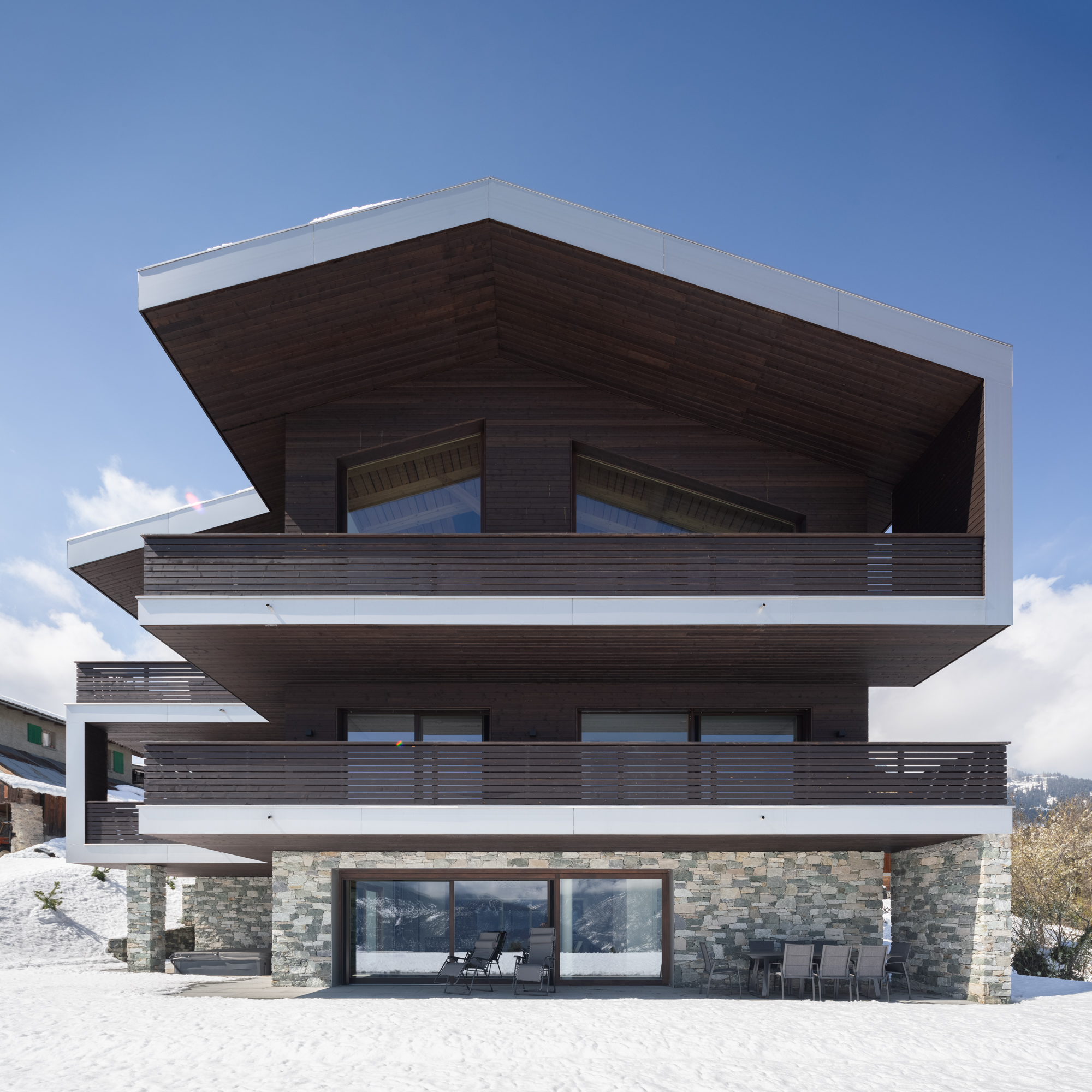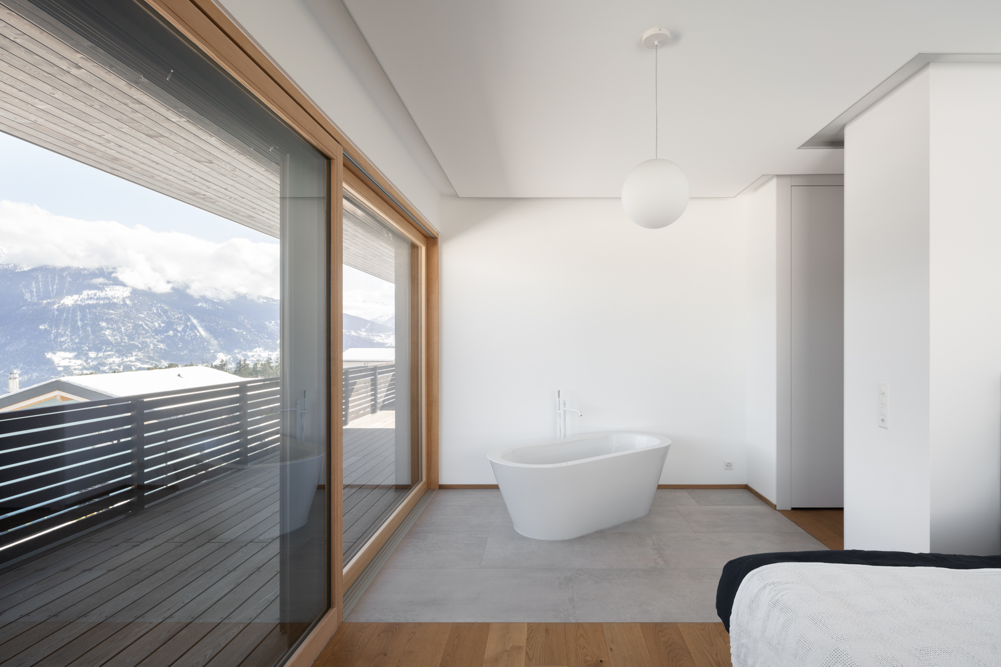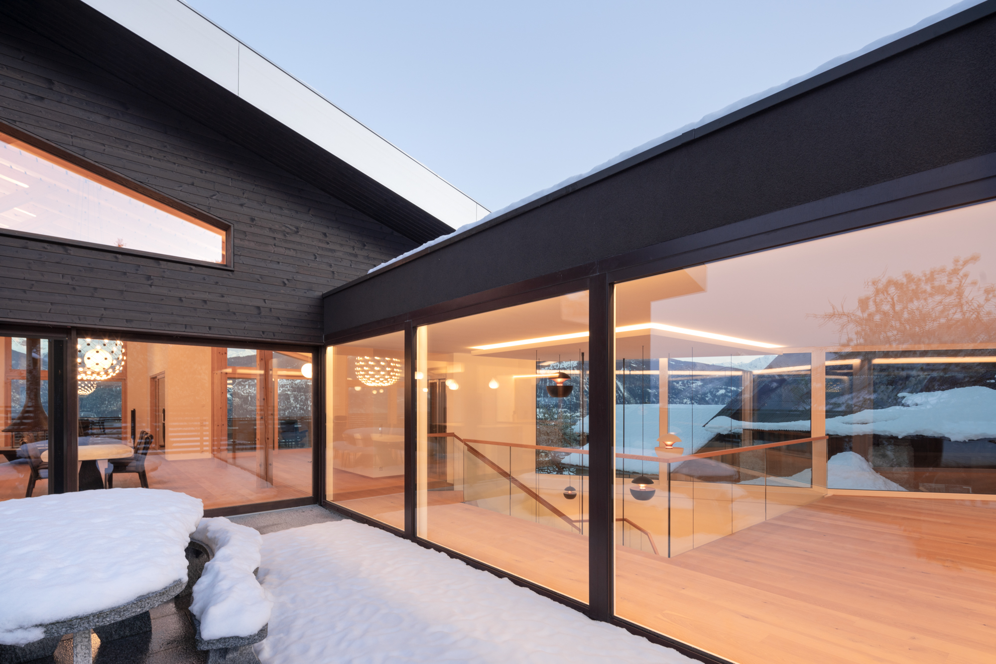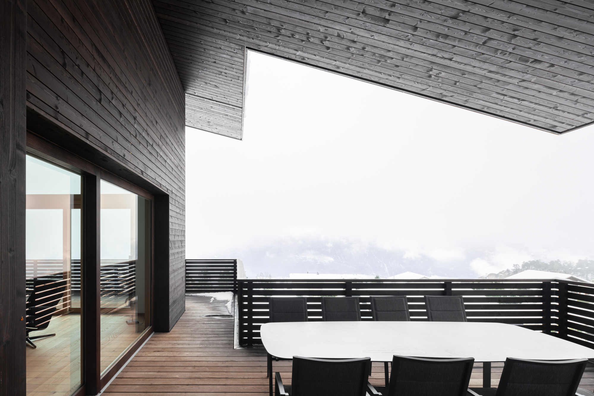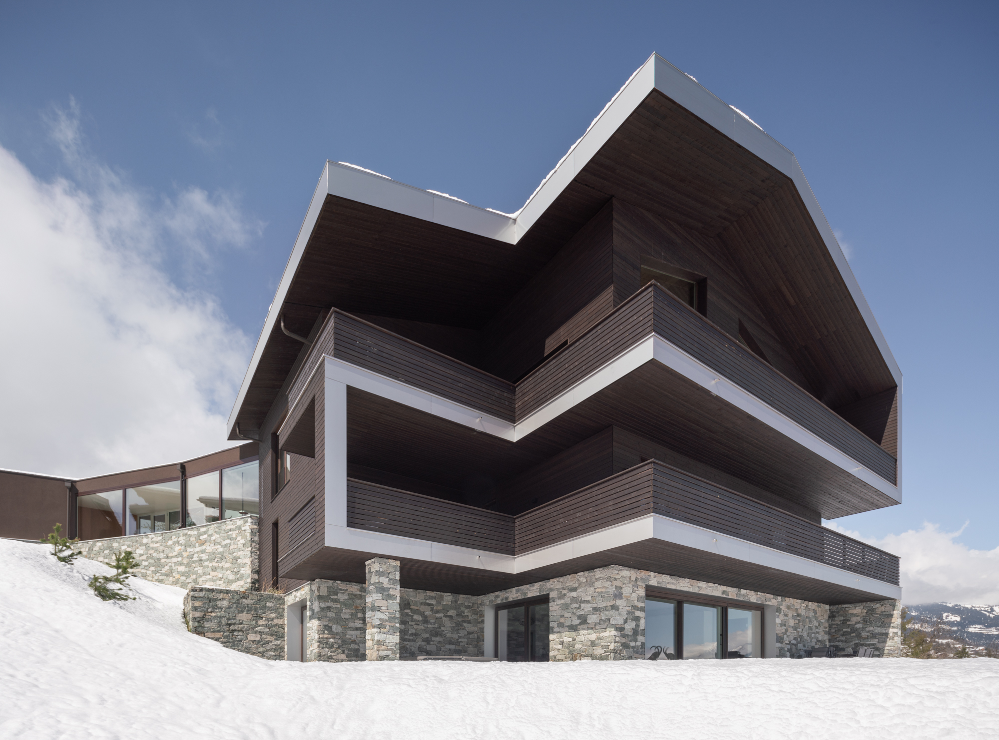 Jede Etage verfügt über großzügige Außenbereiche, die ein spektakuläres Panorama auf die Walliser Alpen sowie einen atemberaubenden Blick auf das Rhonetal, das sich bis nach Leuk erstreckt, bieten.