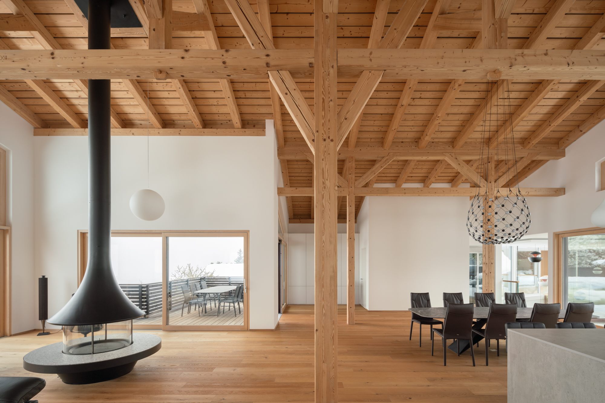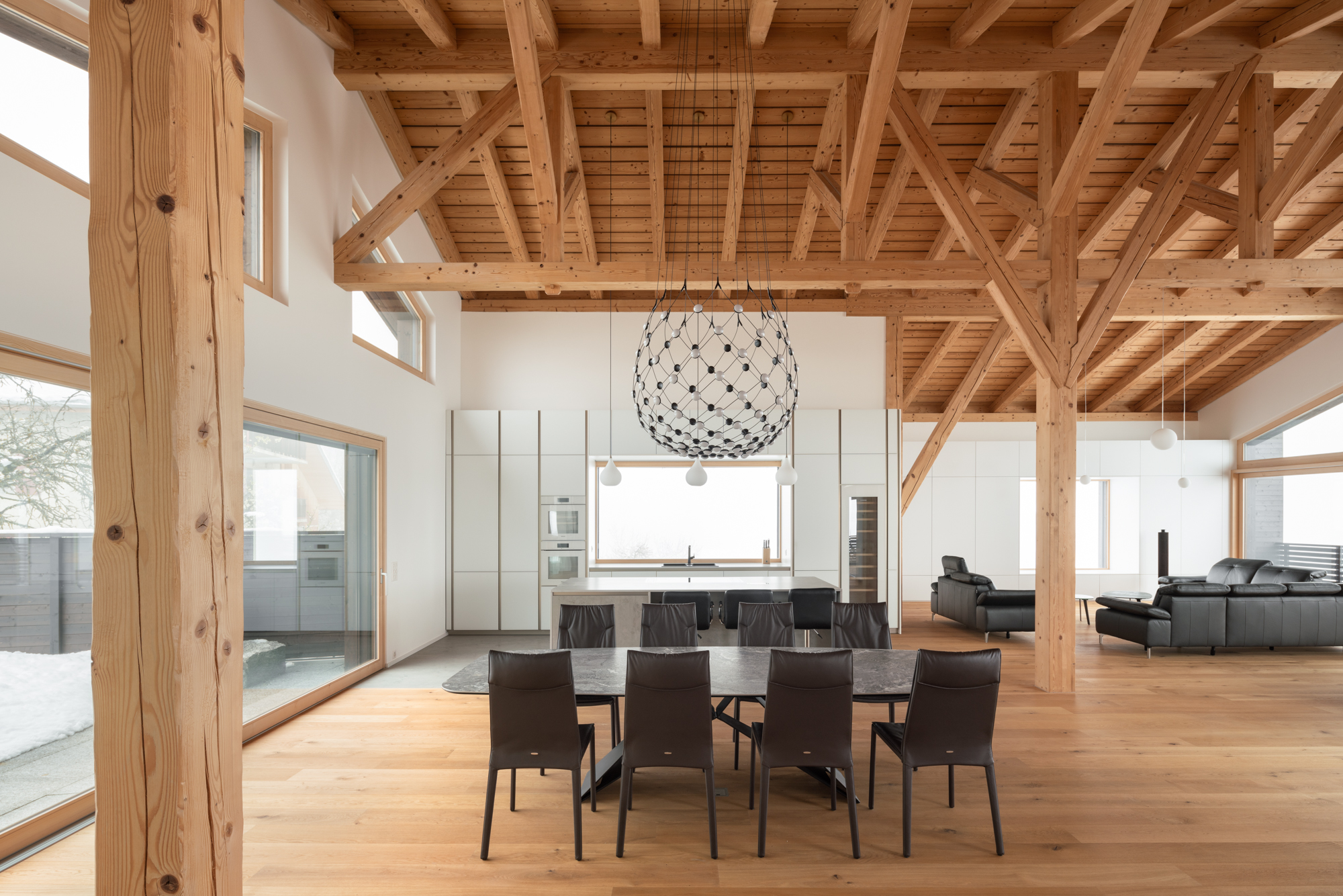 Das Obergeschoss, das sich auf derselben Ebene wie die Garage befindet, beherbergt die Hauptwohnbereiche unter einem wunderschönen, nach altem Vorbild geschnitzten Dachstuhl, der dem Raum ein angenehmes Volumen verleiht.