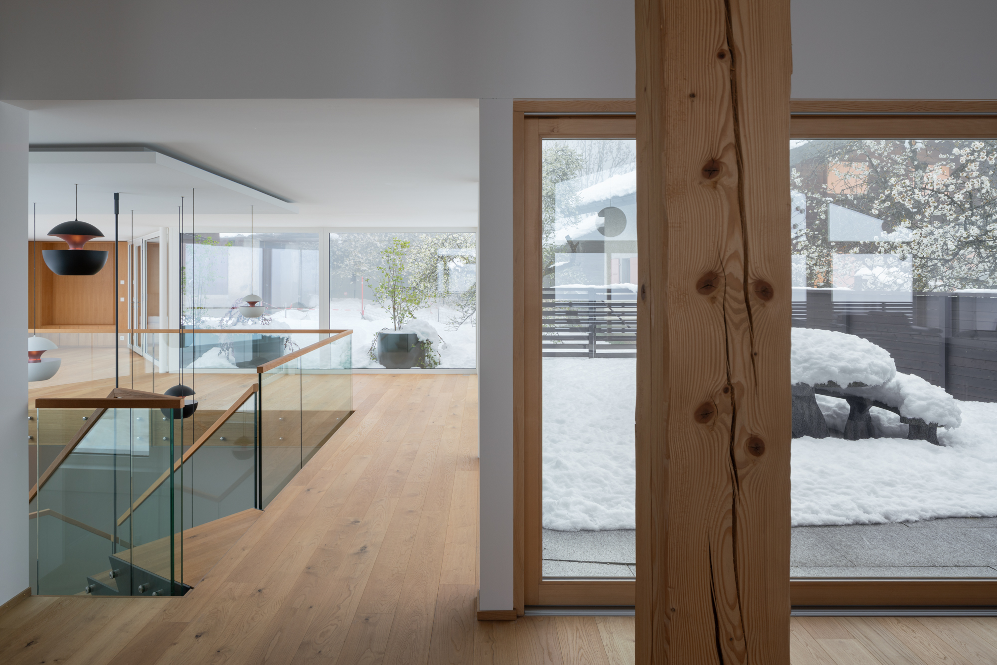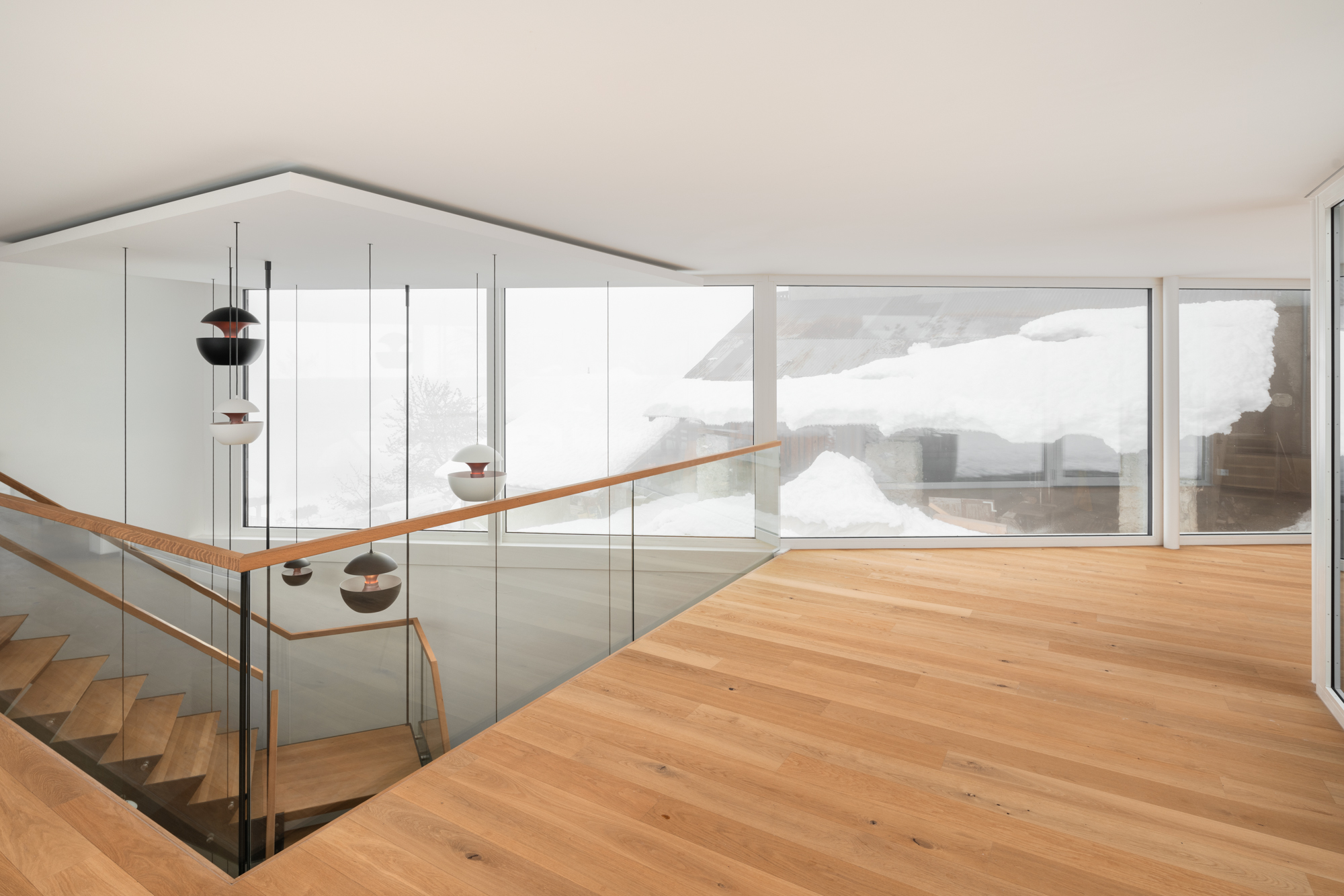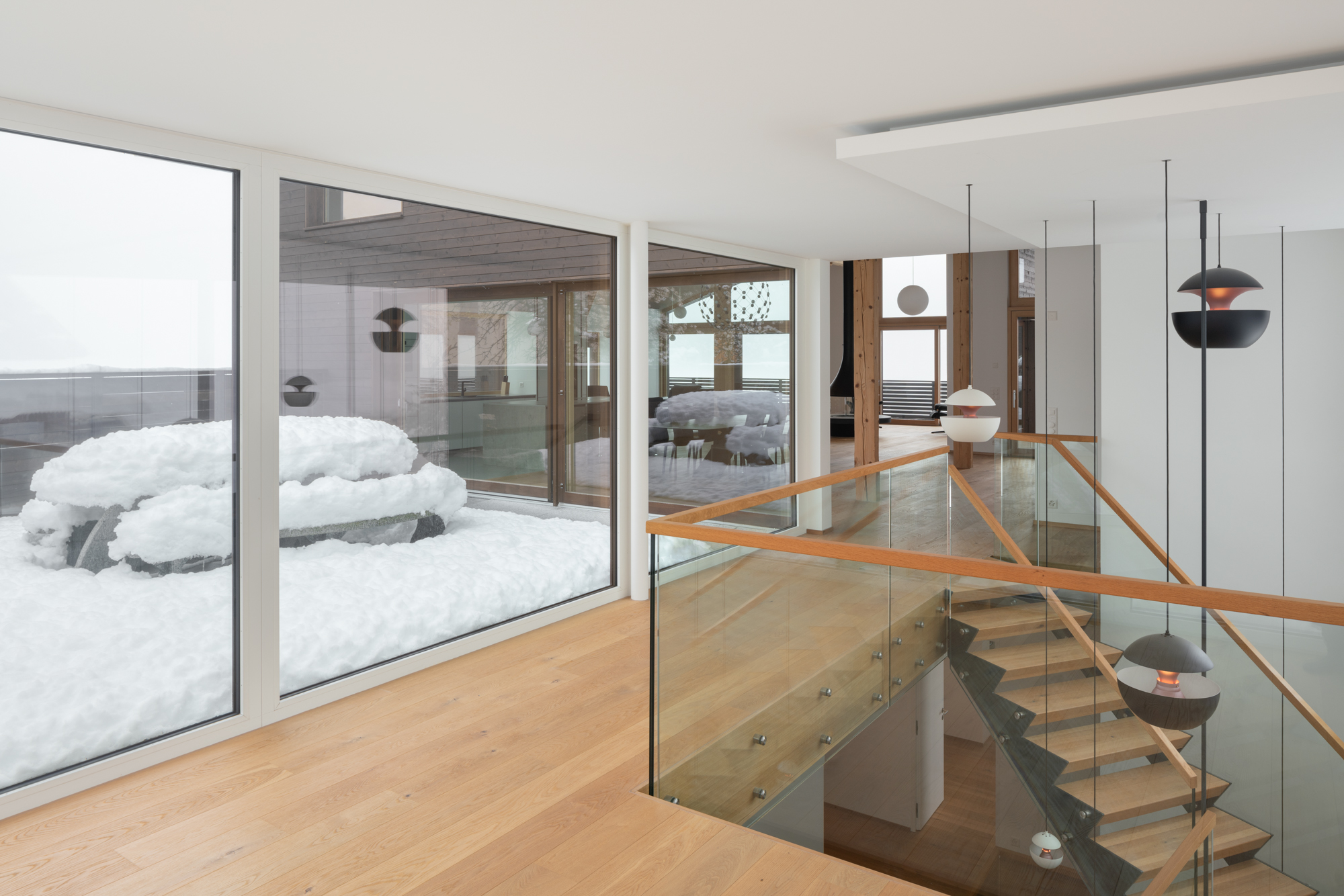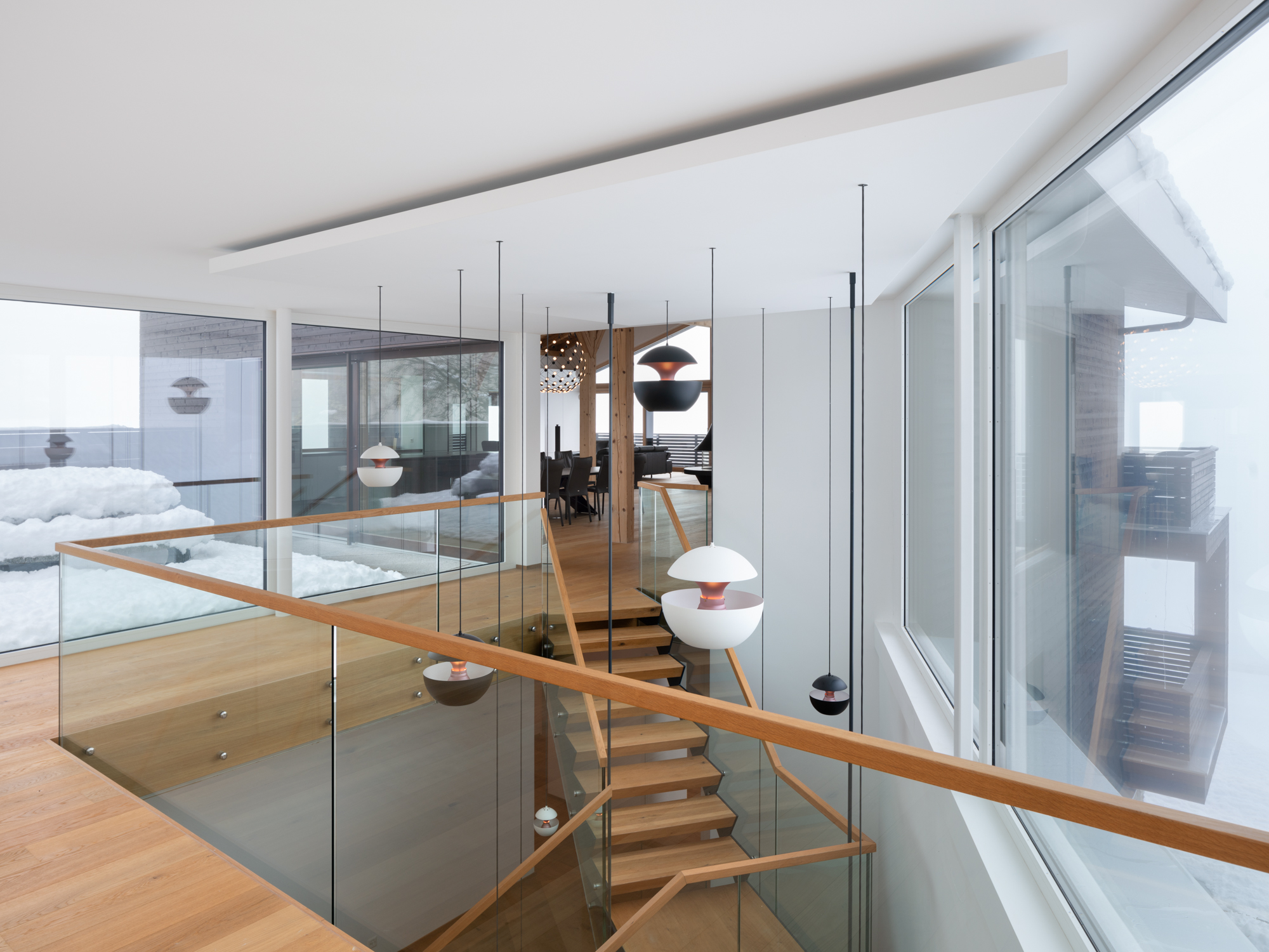 Dieses in der Luft schwebende Treppenhaus erschließt die drei Stockwerke des Hauptchalets und bietet ein einzigartiges architektonisches Erlebnis.