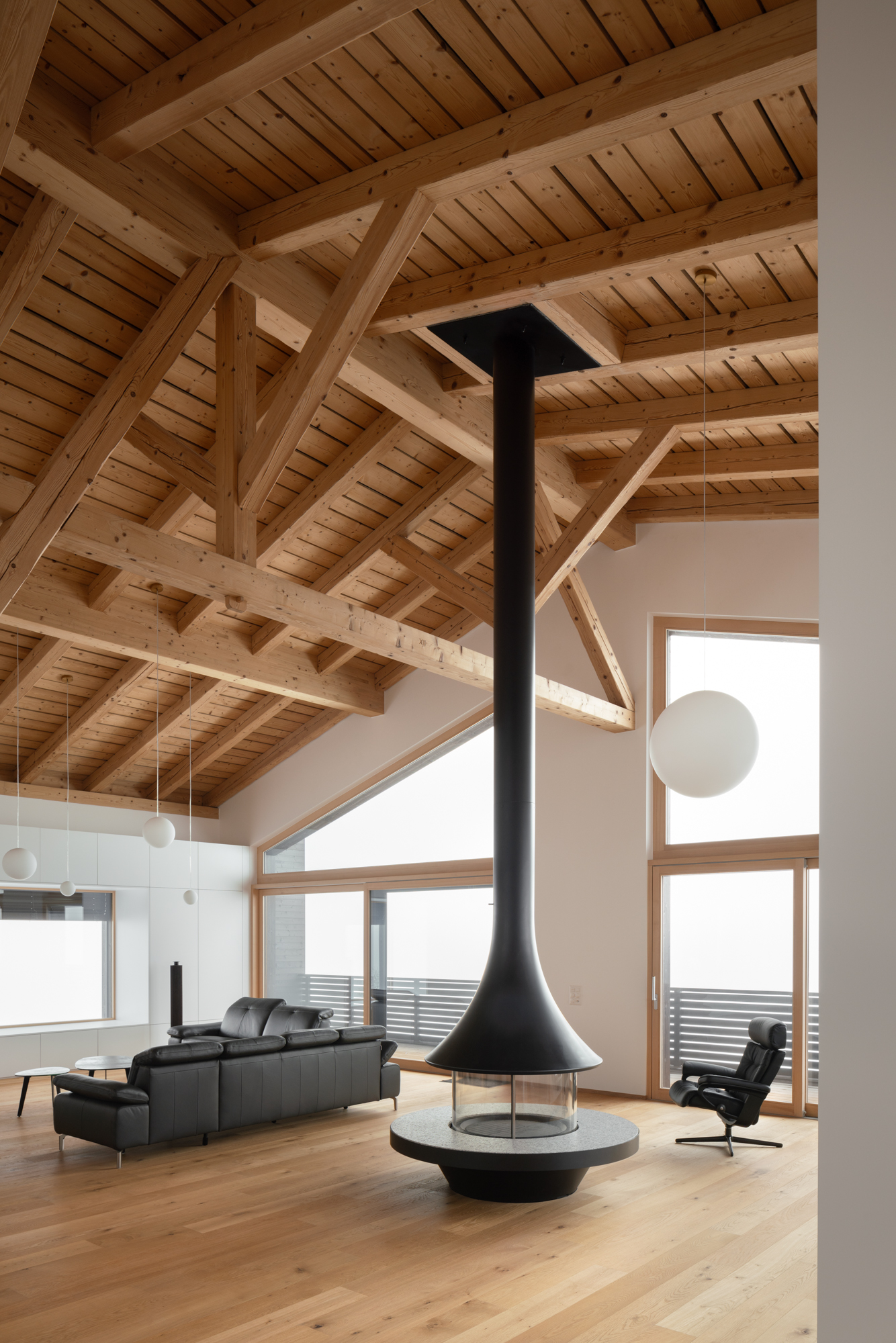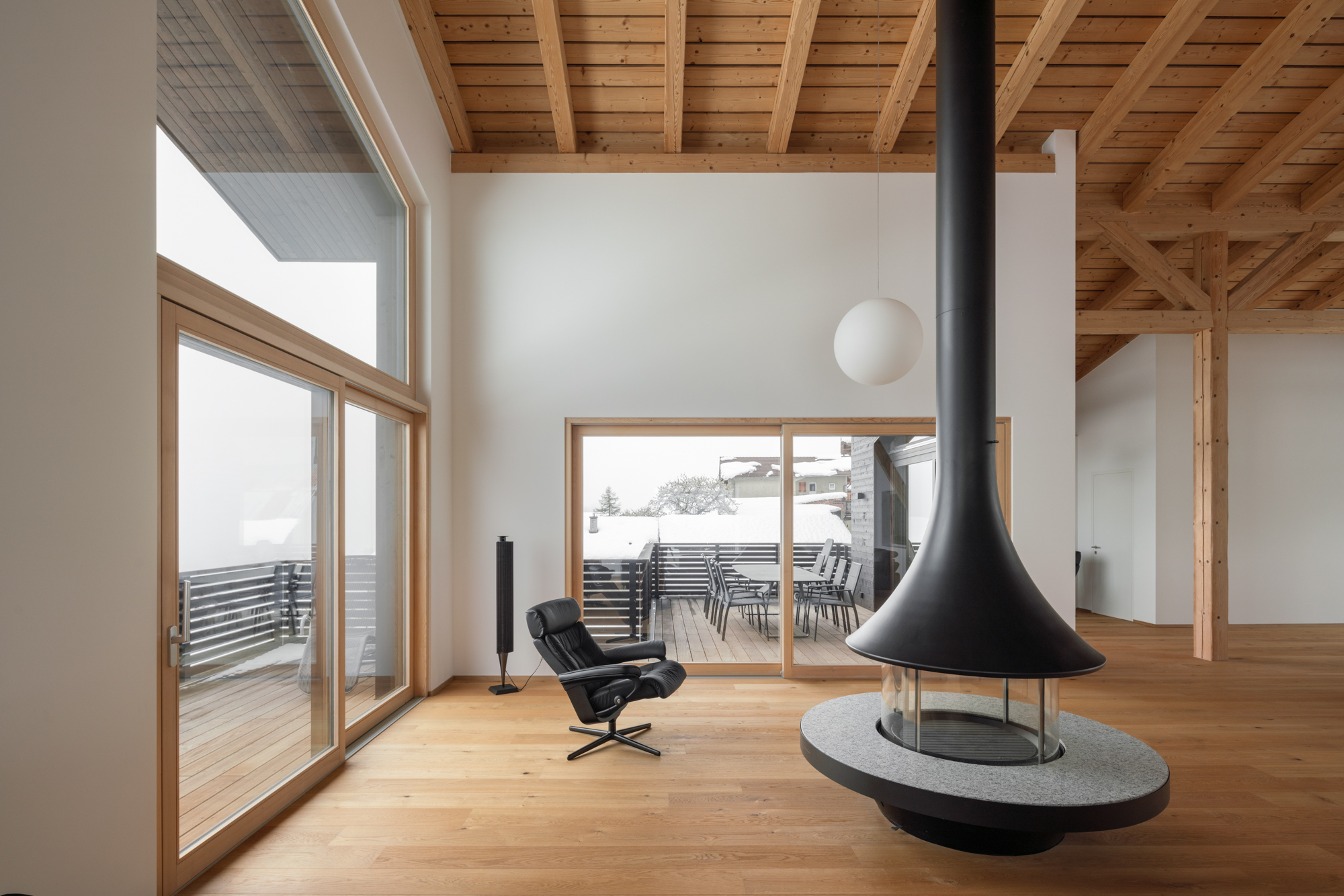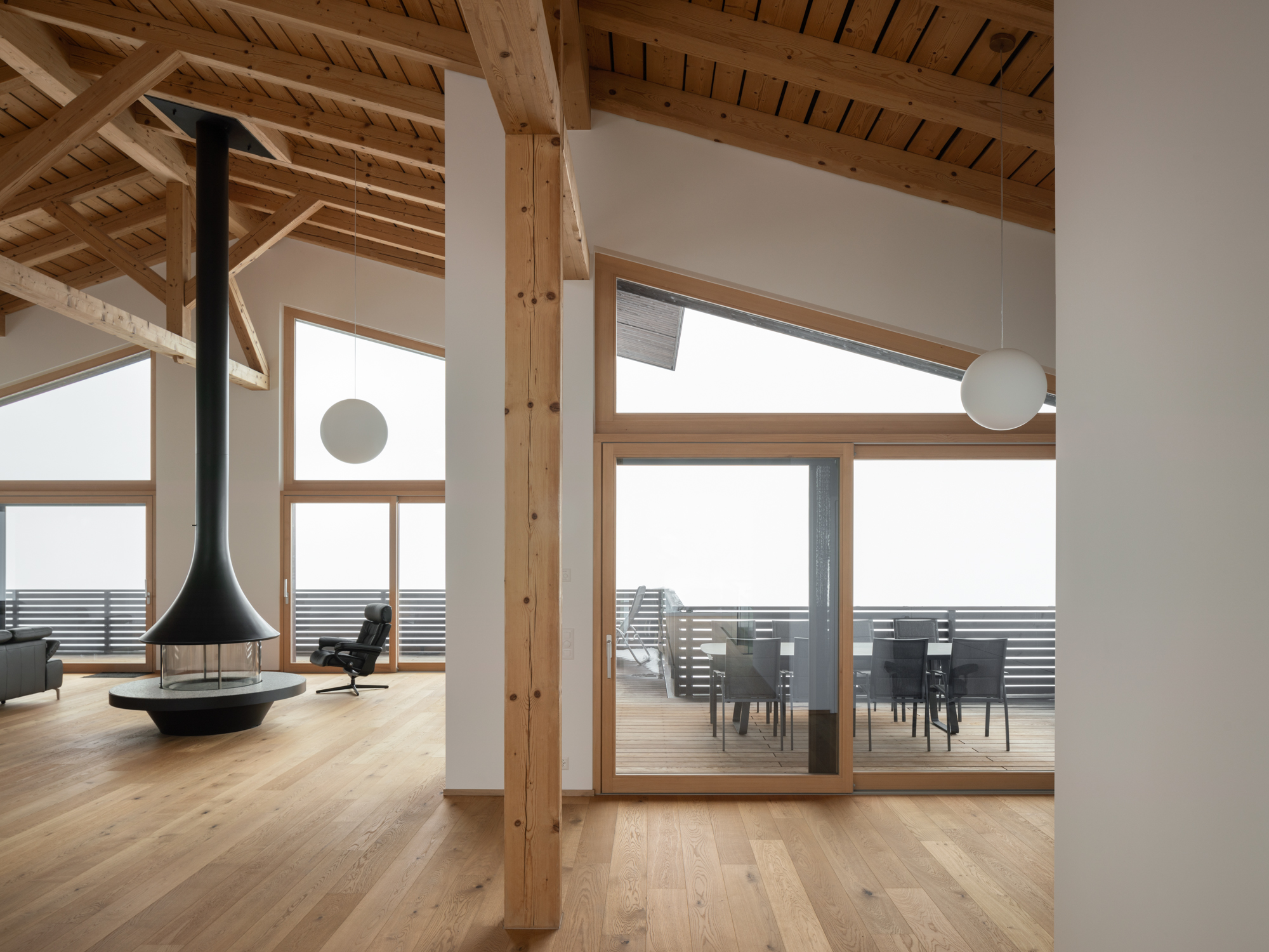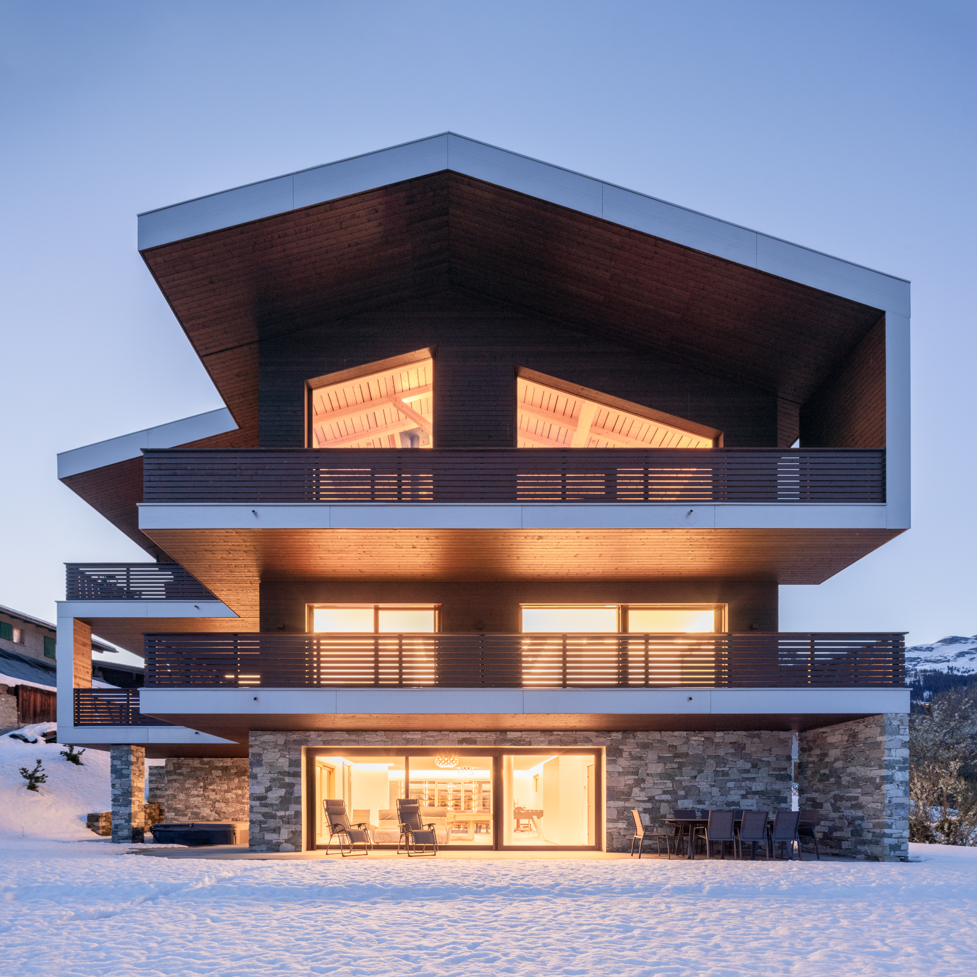 Dieses in der Luft schwebende Treppenhaus erschließt die drei Stockwerke des Hauptchalets und bietet ein einzigartiges architektonisches Erlebnis.