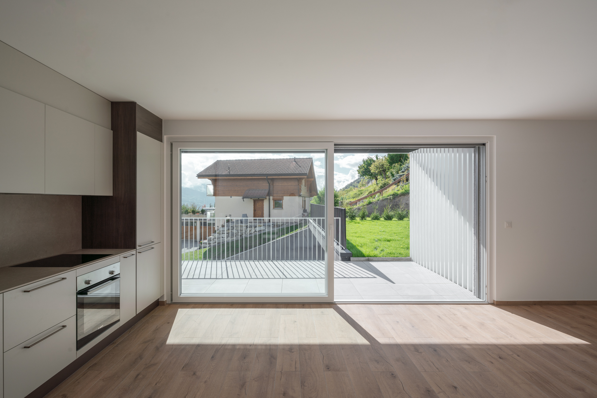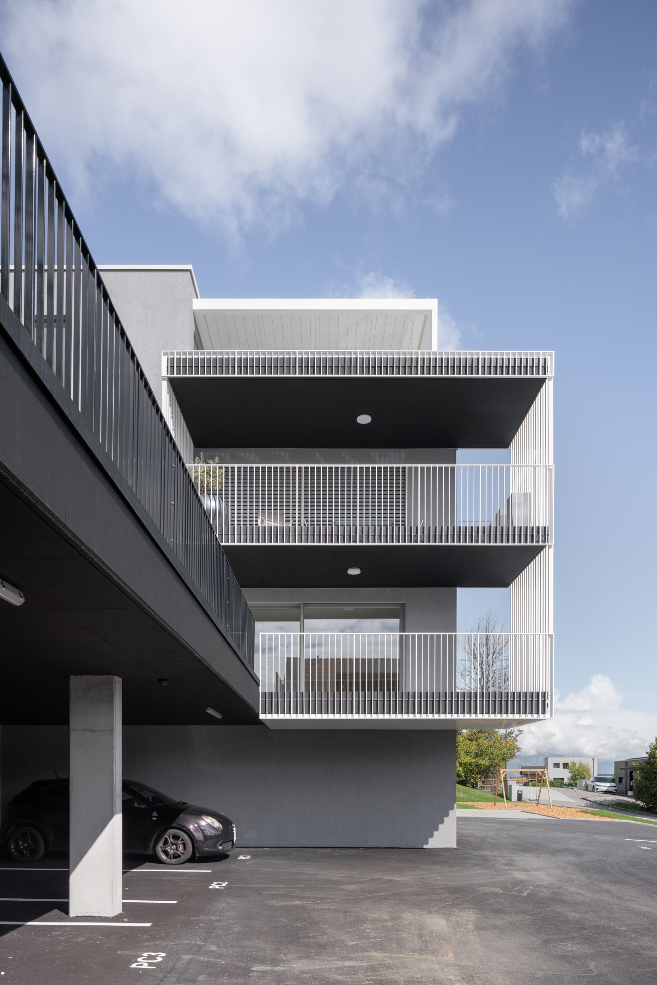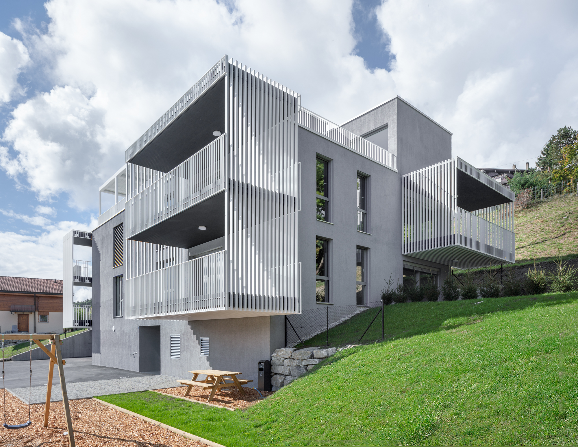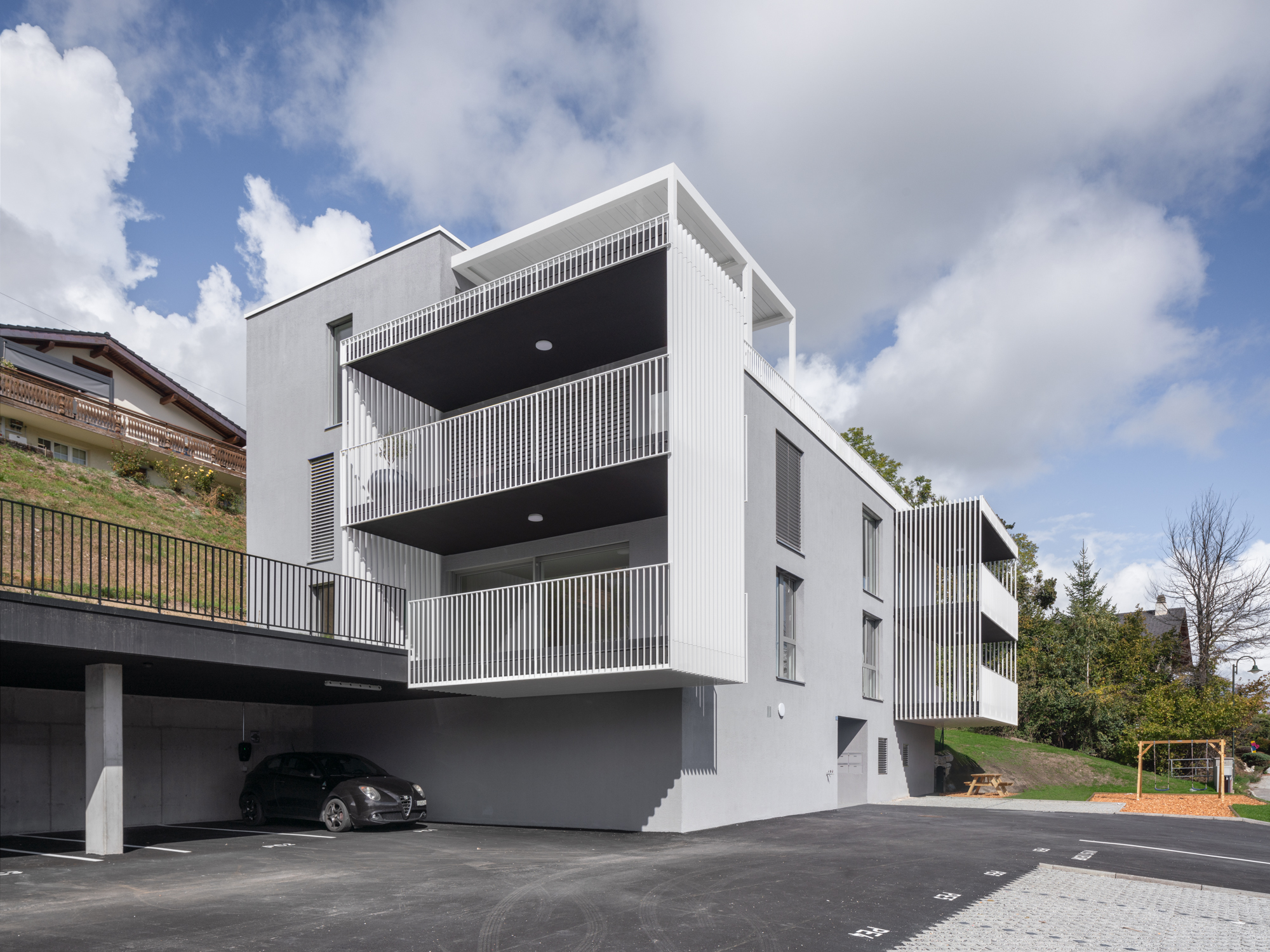 Das Projekt ist um Klusen-Elemente herum aufgebaut und umfasst 7 Wohnungen, von 2.5 Zimmern bis zu 4.5 Zimmern im Attikageschoss, die jeweils über eine sehr geräumige Terrasse verfügen.
